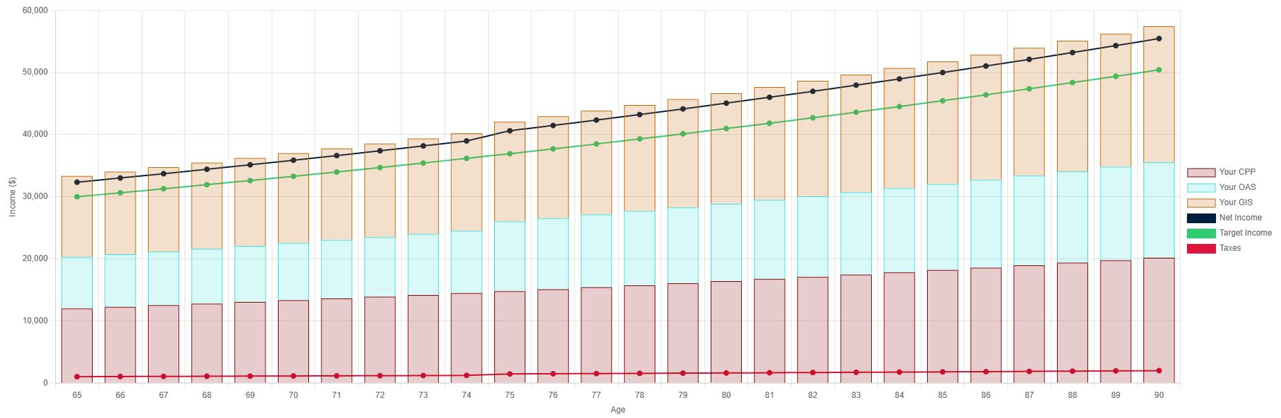 Let's say you're single and 65 years old and are eligible for 70% of the maximum CPP benefit which equates to $12,037/year (as of January 2025). (The CPP calculation is complex, but a a rough estimate says that 70% of CPP translates to earning an average yearly income of about $50,000.) If you take OAS at 65 then that would be an addition $8,300/year. Since this income total is less than GIS minimum income amount, you would be eligible for the maximum GIS benefit of $13,043/year. Even more exciting, the GIS is non-taxable.