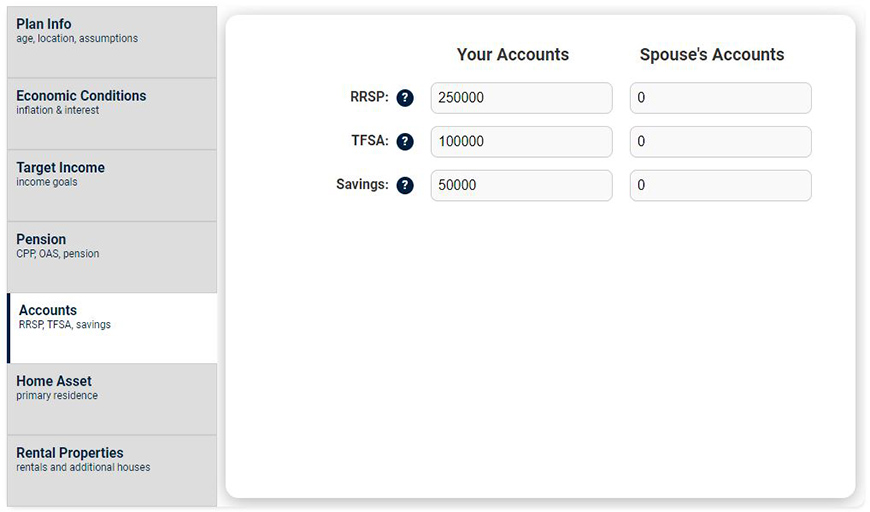 - TFSA: (Canada) Enter the total ammount of money you will have in your TFSA account at the time of retirement.