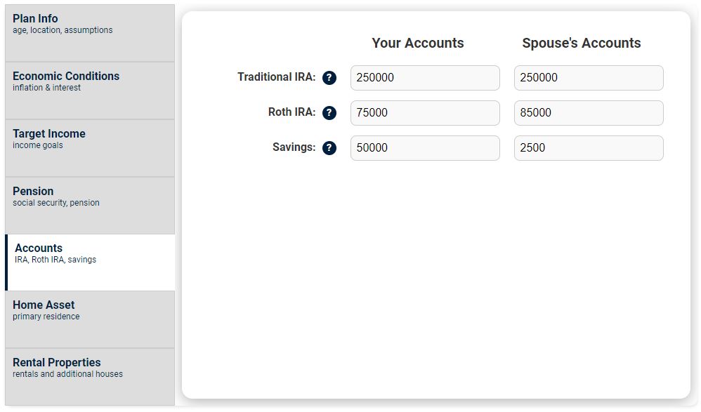 - Your spouse is assumed to have the same life expectancy. (This feature will be updated in future advancements.)