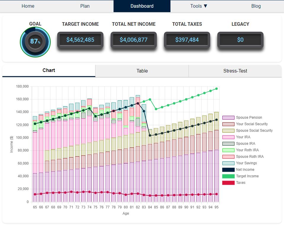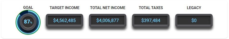 - Goal: Shows the percentage of reaching your overall retirement finacial goal. 100% means that you have met your after-tax income targets every year. If it is greater than 100%, then you have money left over at the end of you plan.