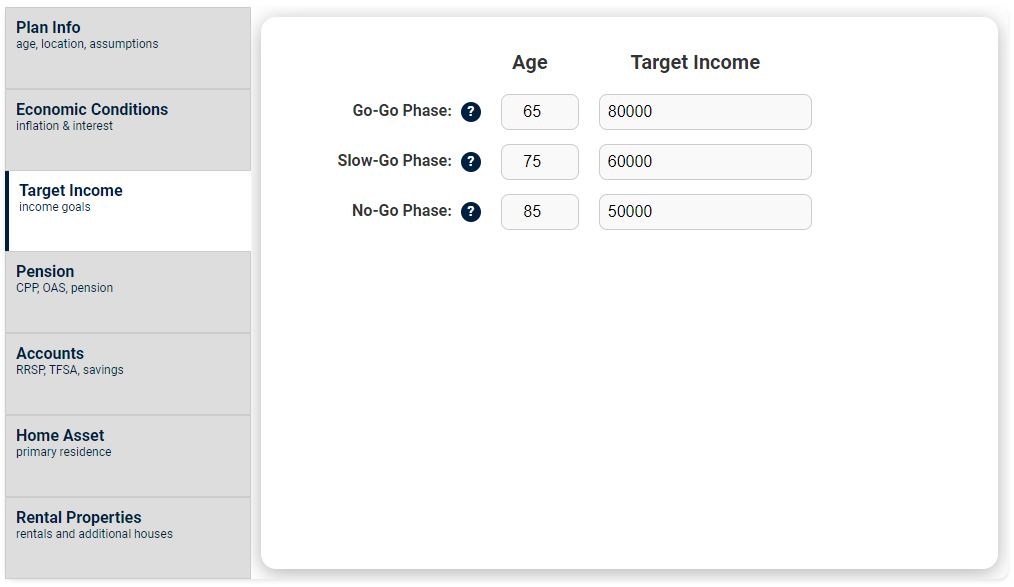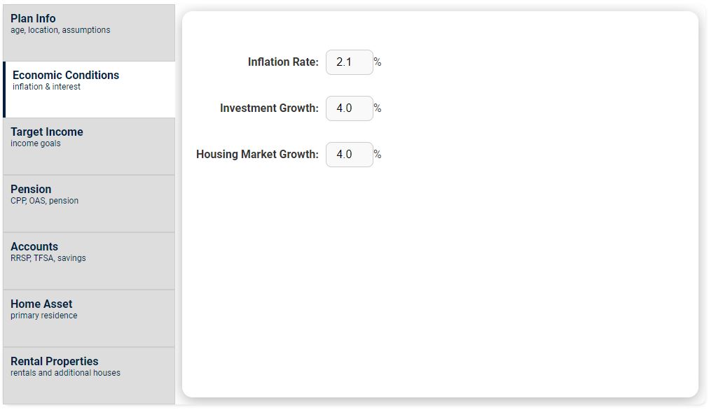 - Inflation Rate: Yearly rate of inflation. This will impact your target income and pensions adjusted by inflation.