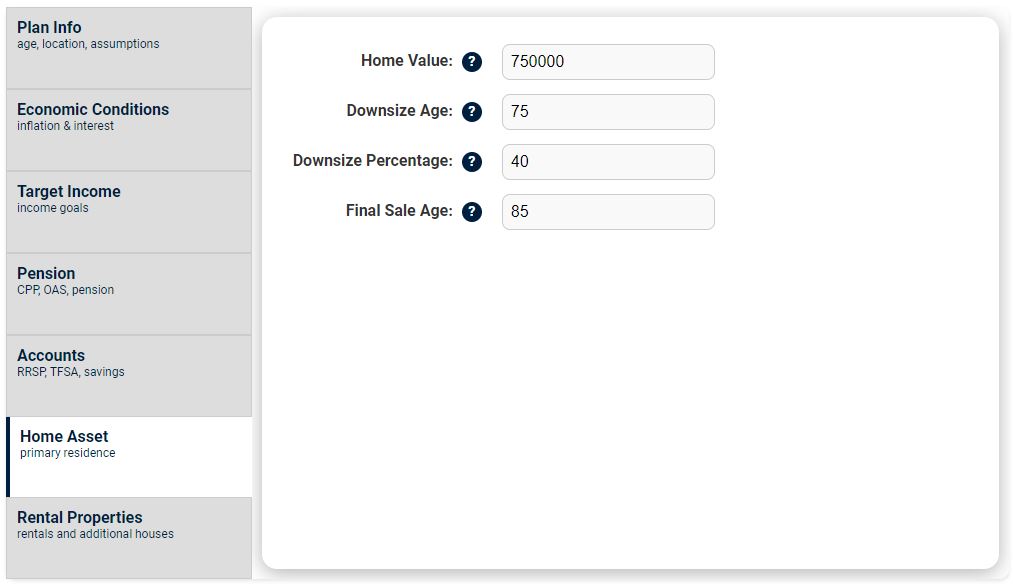- Downsize Percentage: The percentage of the house you will sell. For example, if you house is worth $500,000 and you want to downsize to buy another house for $300,000 and keep $200,000, then you would enter 40% (i.e. $200,000/$500,000). If you enter 100%, then you are saying you will sell your home and keep everything for retirement income.
