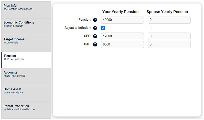 - Pension: Typically a company or governement defined benefit pension plan. Enter your yearly pension income before tax in today's dollars.