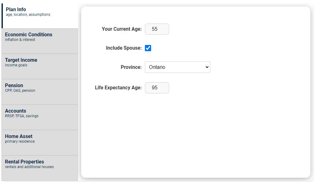 Under the Plan menu, click the "Plan Info" tab. Enter your current age, select if this plan will include a spouse, selected you State or Province, and choose your life expectancy.