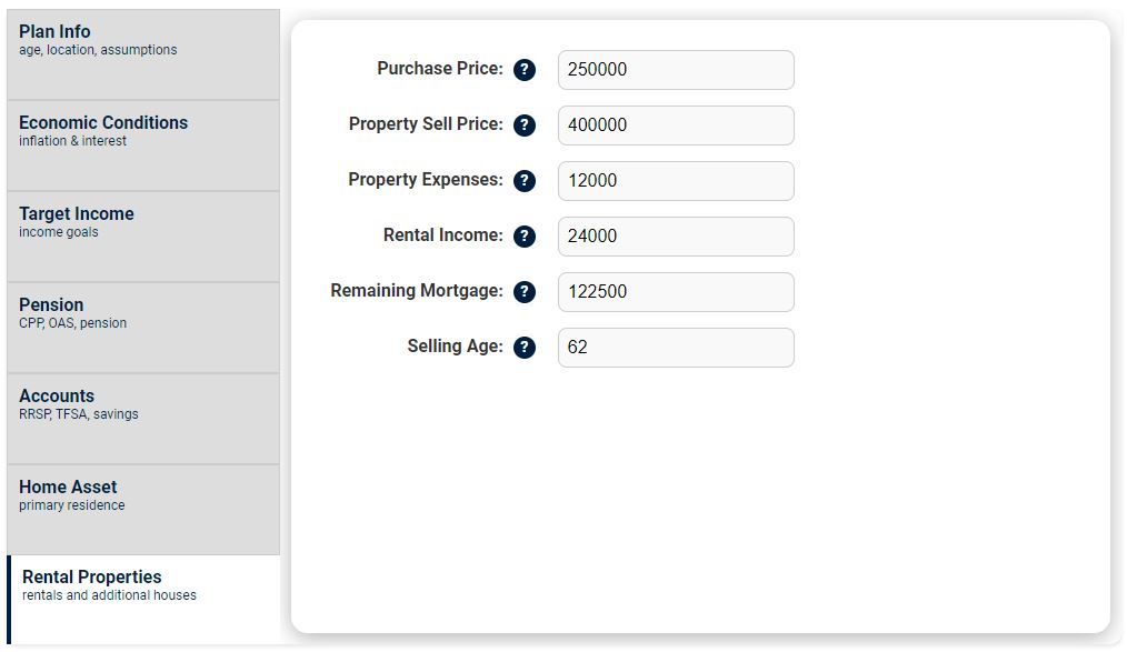 - Selling Age: The age when you will sell the rental property. If it is left blank, set to zero, or set higher than your life expectancy, then this property will not be sold.